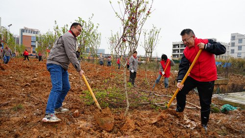 活動現(xiàn)場,黨員們熱情高漲。 大家分工協(xié)作,對土地進(jìn)行平整美化, 清理雜草碎石,翻松土壤,揮鍬鏟土,扶苗填坑、培土,每一個環(huán)節(jié)都一絲不茍,現(xiàn)場呈現(xiàn)出一派熱火朝天的勞動景象。經(jīng)過一番辛勤勞動, 一棵棵新栽種的樹苗迎風(fēng)挺立,為校園增添了一抹新綠,也種下了春天的希望。